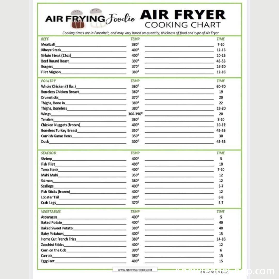 The key to air frying success lies in understanding the intricacies of both time and temperature. Our cheat sheet is designed with simplicity in mind and allows you to customize your cooking. 🌟