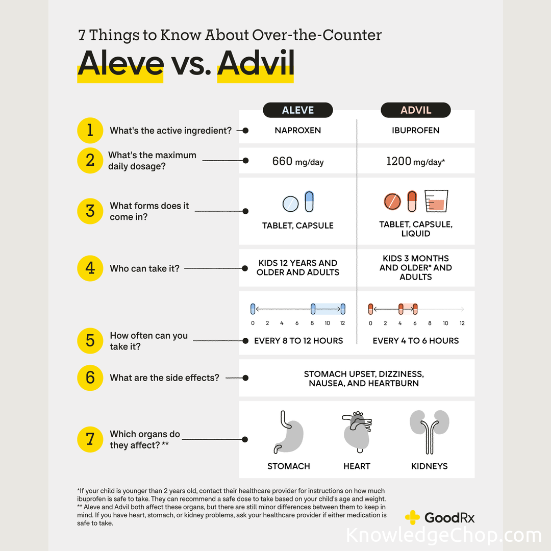 As the Knowledge Ninja, it’s my duty to ensure you understand the battle between two common pain relievers: Aleve (Naproxen) and Advil (Ibuprofen). First and foremost, both medications are part of the nonsteroidal anti-inflammatory drug (NSAID) family, meaning they help to alleviate pain, fever, and inflammation.