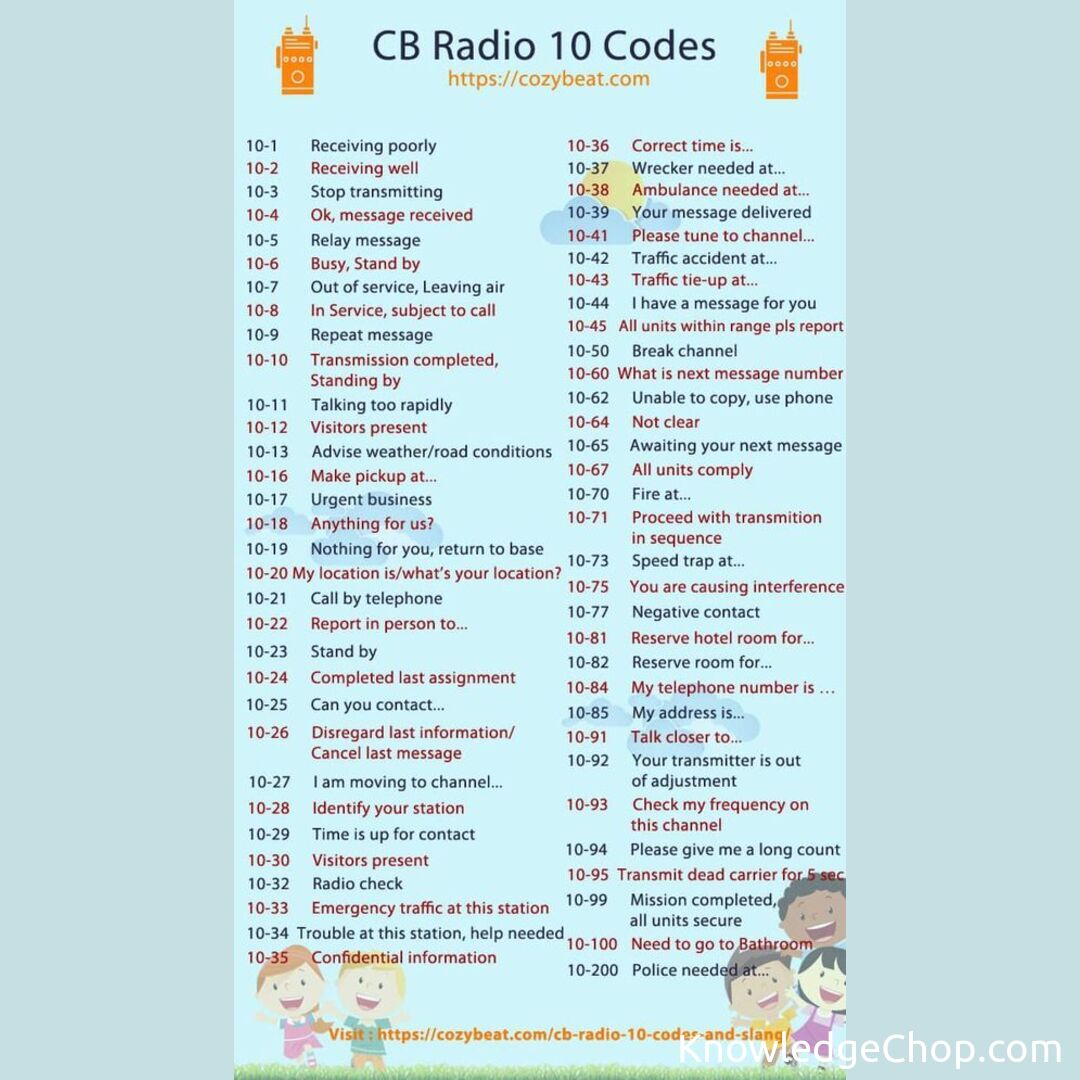 CB 10 Codes, first introduced by public safety and law enforcement agencies, offer a concise and efficient means of communication. This system reduces misunderstandings and encourages a smooth flow of information. For instance, 10-4 signifies ‘message received and understood,’ whereas 10-20 refers to one’s location. Unravel the full list of these mysterious codes at knowledgechop.com.