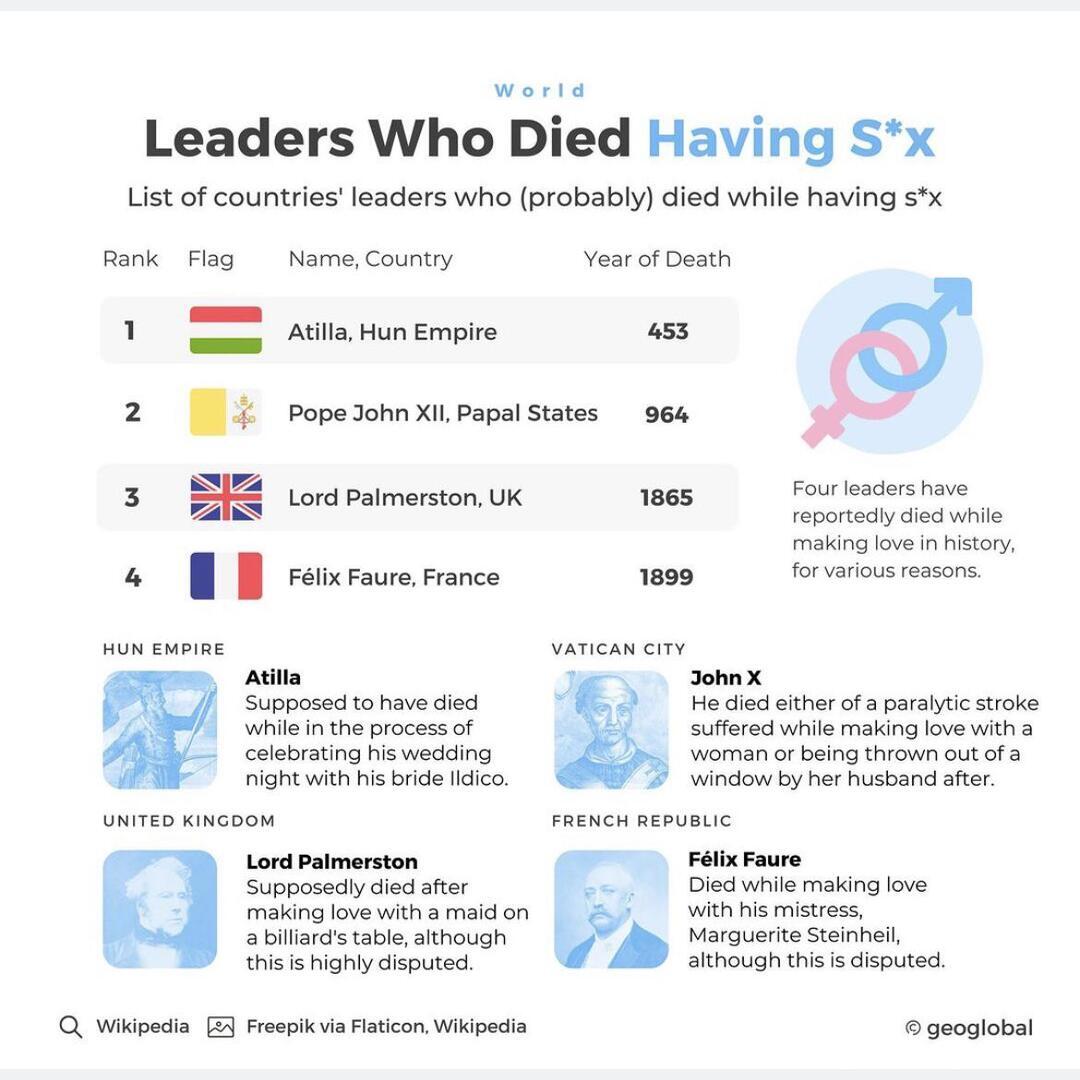 But fret not, our shaolin-like investigation skills have led us into the steamy realms of history to bring you a list of world leaders who (probably) died having sex. This tantalizing list includes the likes of Attila the Hun, Pope John XII, and President FΓ©lix Faure of France, among others.