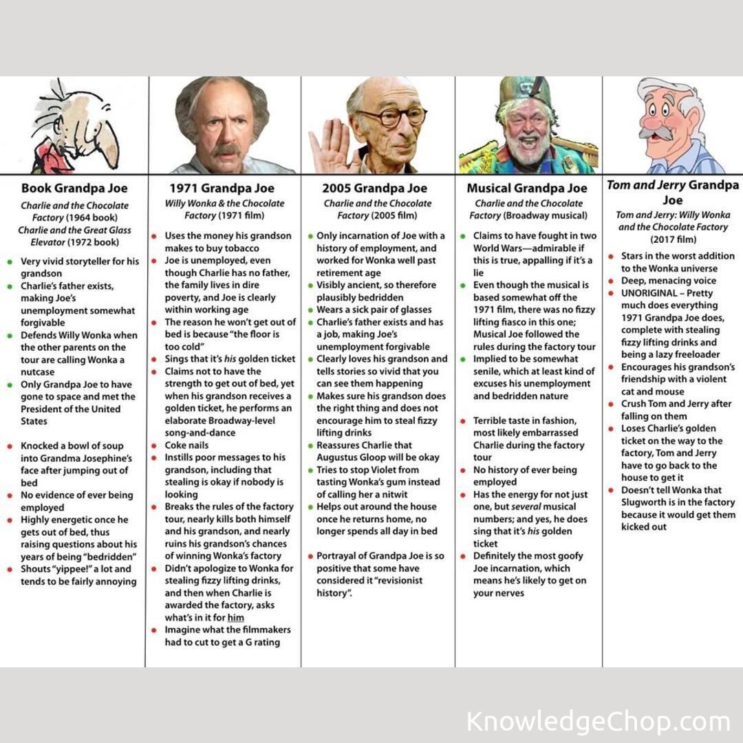 Each adaptation of Grandpa Joe offers a unique flavor, highlighting different aspects of his bond with Charlie, the importance of family, and the value of never-ending optimism.
