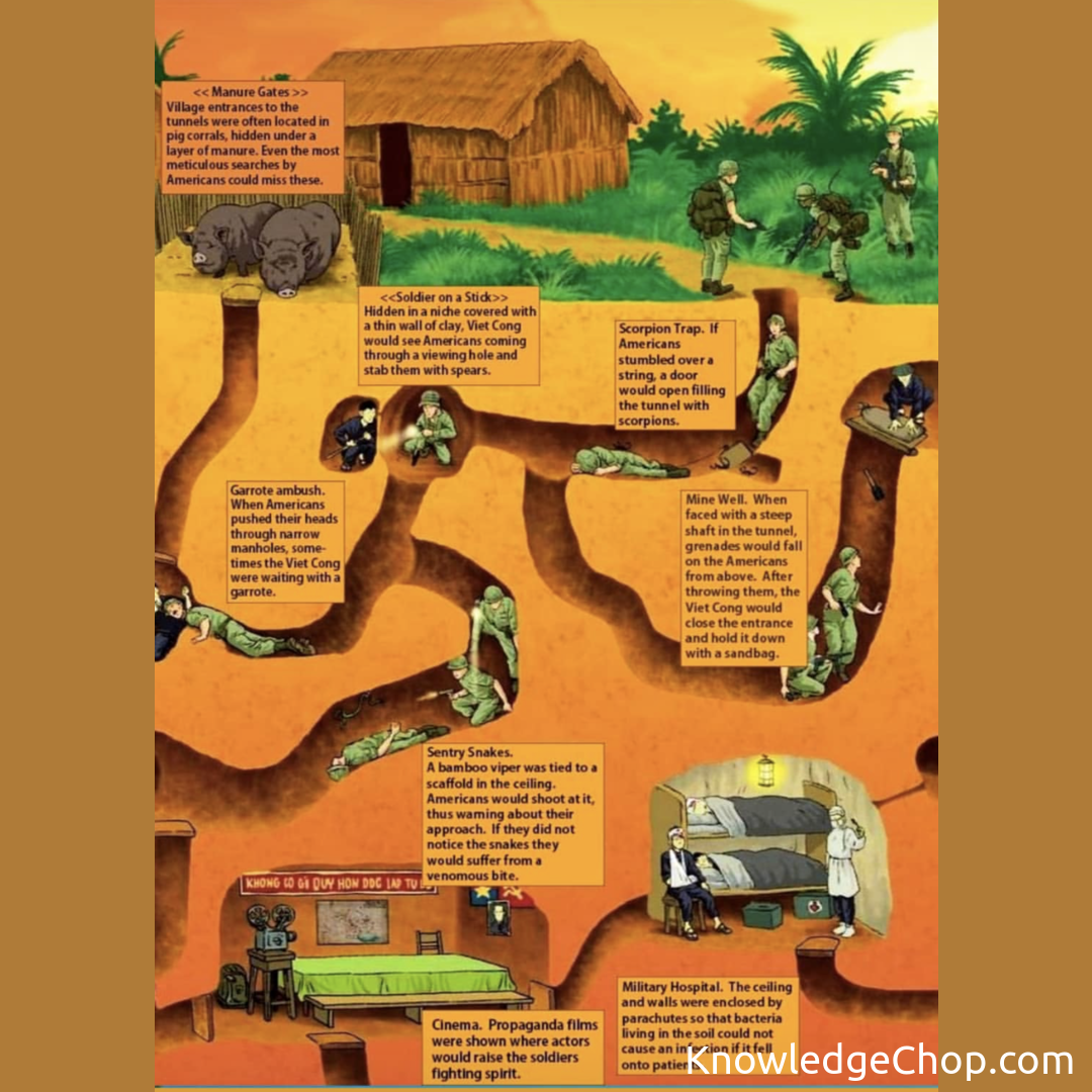 Descendants of ancient ninja warriors, the Viet Cong mastered the art of tunnel warfare. Their underground networks resembled a labyrinth filled with traps, secret entrances, and camouflaged exits. The tunnels were usually dug in hard soil or clay, which helped resist collapse as well as sonic and seismic detection. They even had separate sections for storage, living quarters, command posts, and critical infrastructure. As true ninjas, they exploited their knowledge of terrain, darkness, and deception to evade detection.
