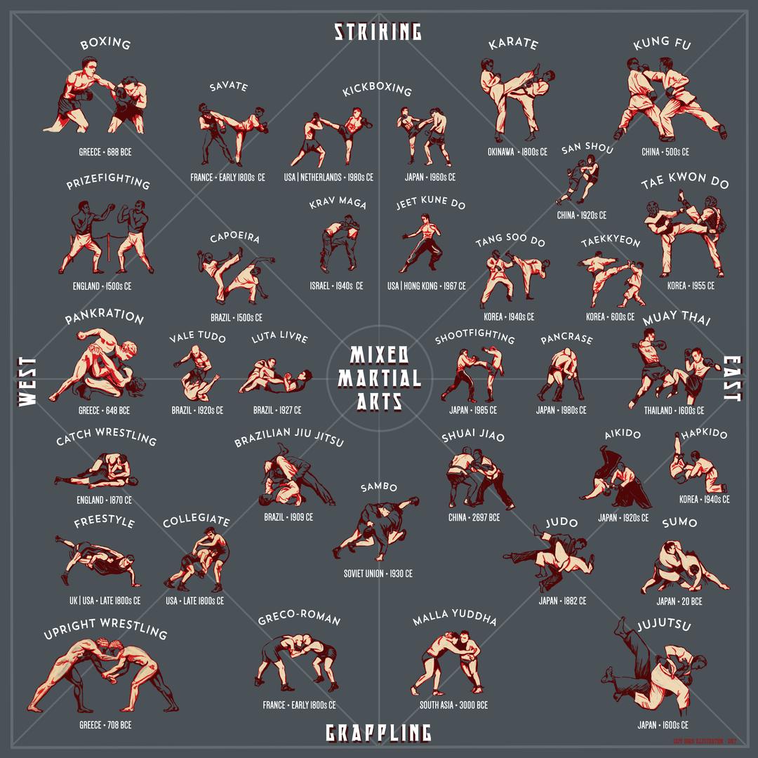 This is an illustrated guide that I made to the styles of martial arts, years of founding and birthplaces.