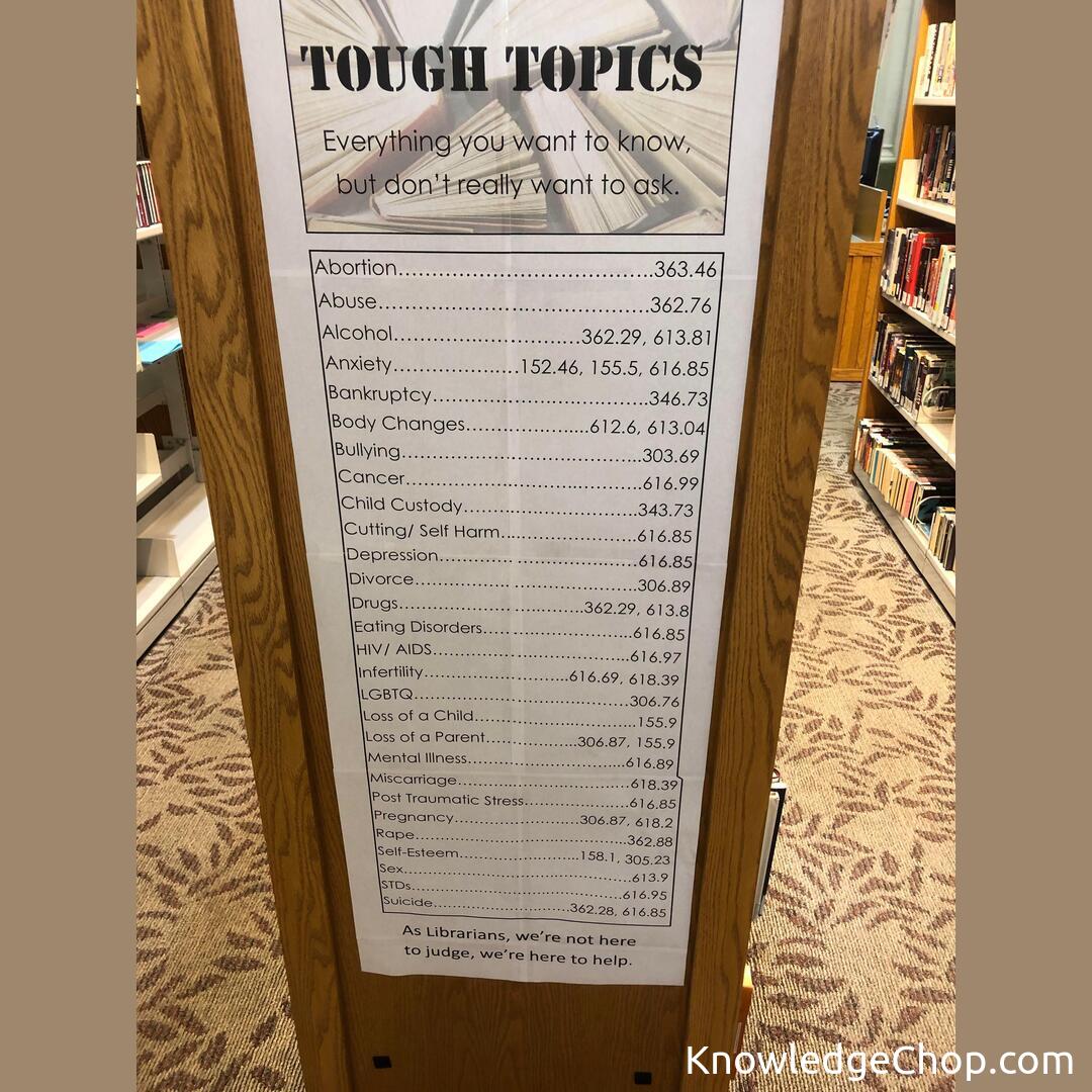 This library hung a Dewey Decimal reference sign for “everything you want to know, but don’t really want to ask”