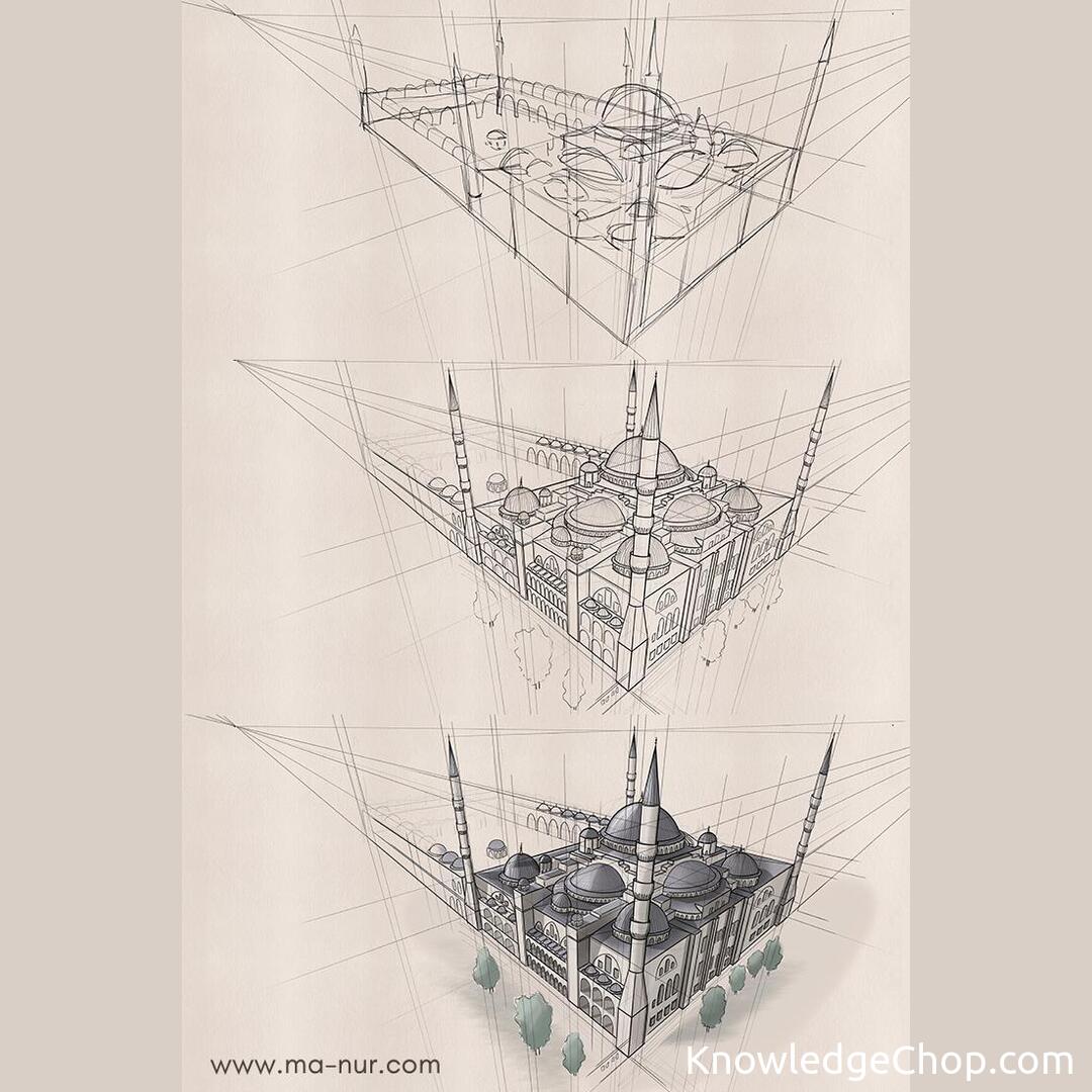Three-point perspective isn’t just a mere artistic trick; it has historical roots in architecture and design. This method enables artists to flesh out their vision in a more vivid and lifelike manner โ a feat that might otherwise prove elusive. By mastering three-point perspective, you’ll be one step closer to channeling your inner ninja architect!