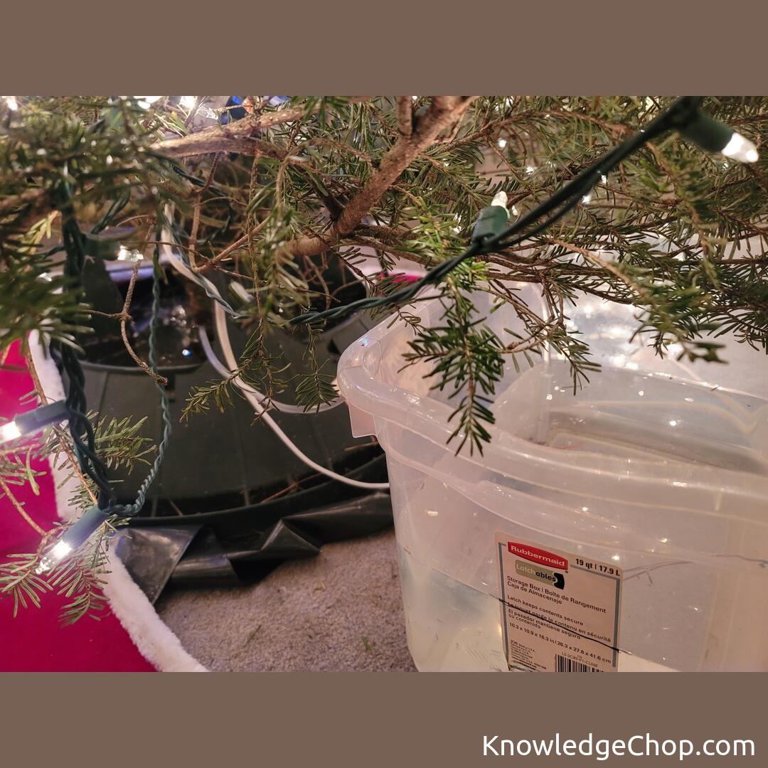 Tired of crawling under the tree to water it? Put a Rubbermaid bin next to it with a 1/4″ hose. Fill hose with water to create a siphon, and mark the bin where the water is full in the tree. Simply water the bin (easy). Also, extends your time between watering!