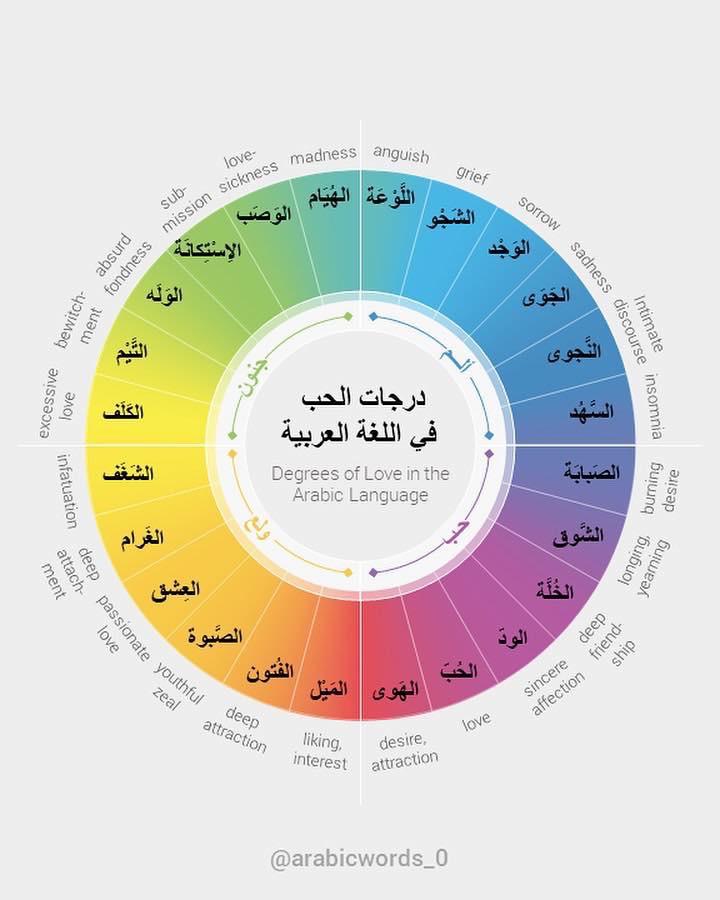 Types of love according to arabic vocabulary. Blue is love+pain, purple is pure love, yellow is love+fondness and green is love to the point of insanity