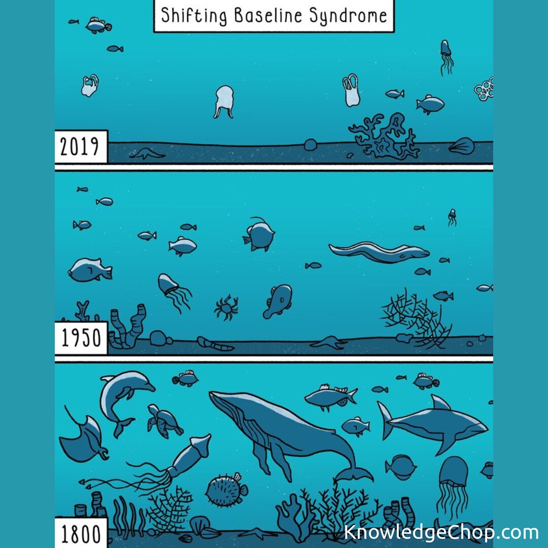 Loss of biodiversity and environmental degradation are often overlooked due to this syndrome. For instance, oceans have seen a drastic decline in the number of large fish, but their absence isn’t truly apparent as our baseline has shifted over time.