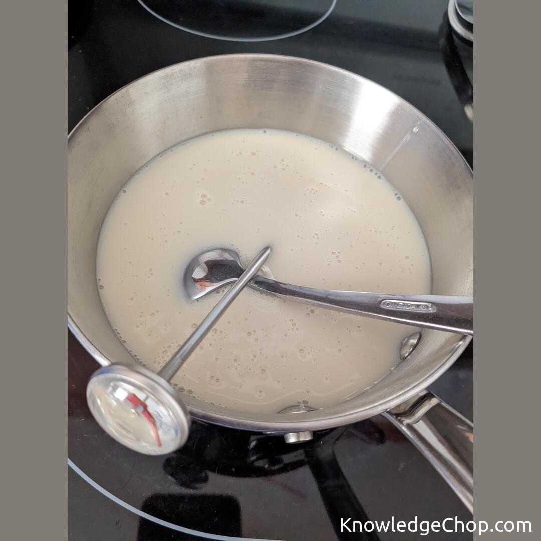 Use a spoon to hold a cooking thermometer while heating milk.