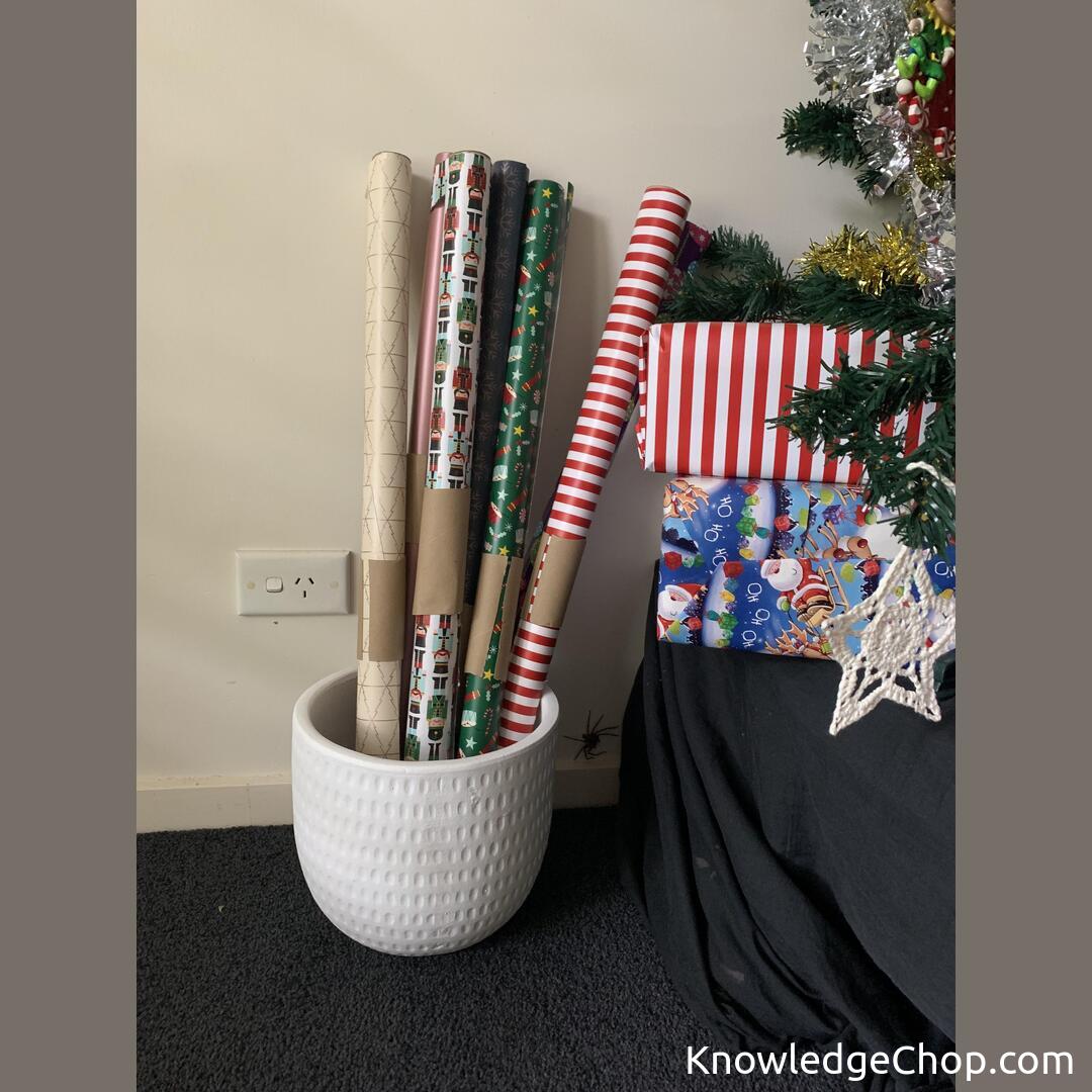 Use old cardboard rolls to keep wrapping paper tidy, also check for spiders.