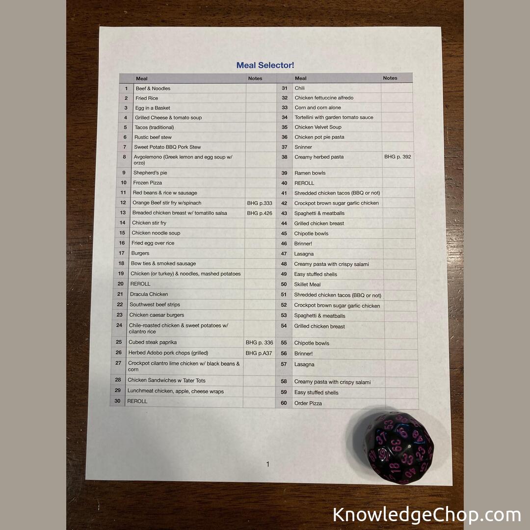 We love meals at home but started to hate trying to pick something. I entered every recipe we ve ever saved and put it in a spreadsheet, got a D60 die and now we roll for dinner options when we make the grocery list each week. Each family member gets a veto, but picking meals is actually fun now.