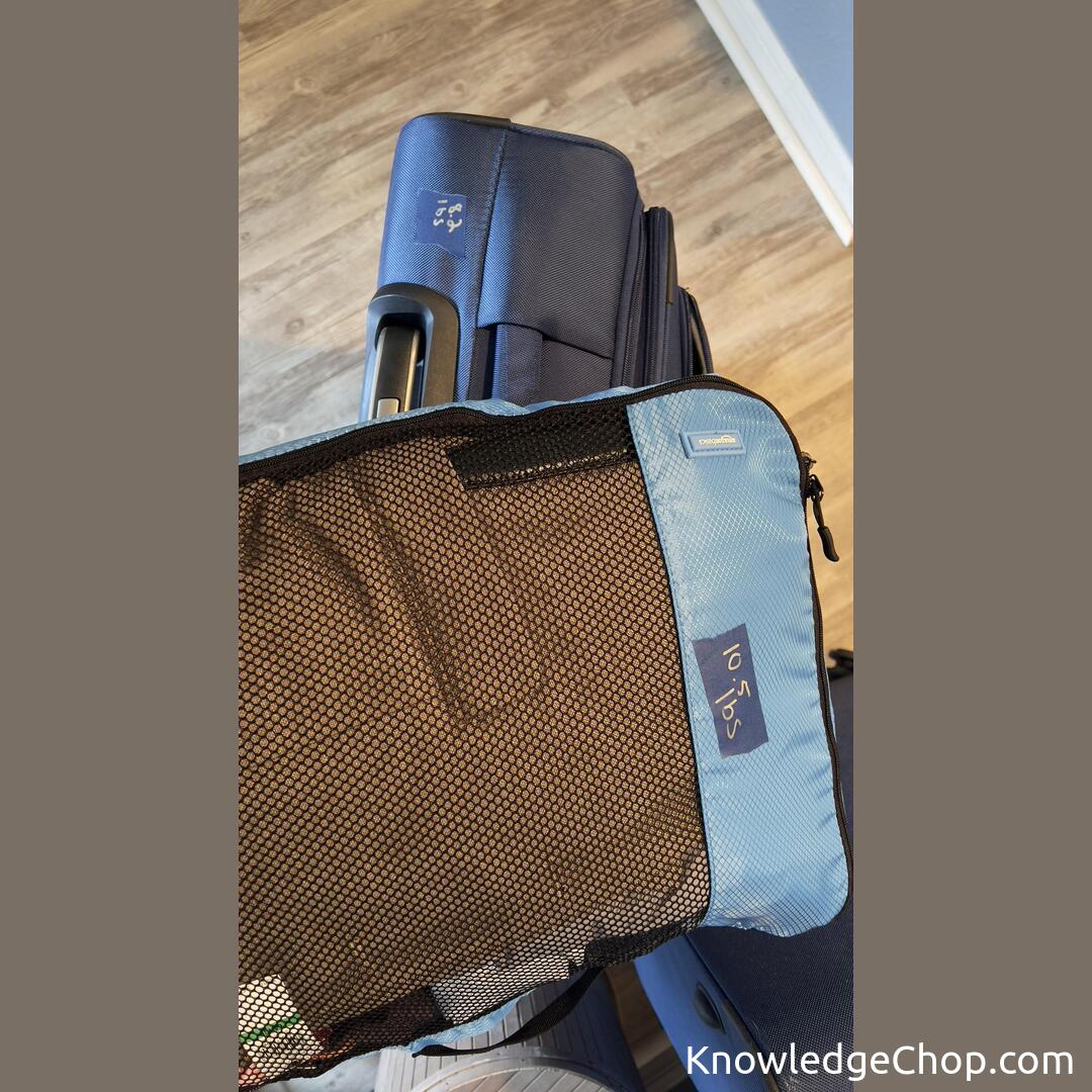 When traveling, write the weight of your suitcase and travel cubes on tape so you can mix and match pieces to avoid going over airline baggage allowances…